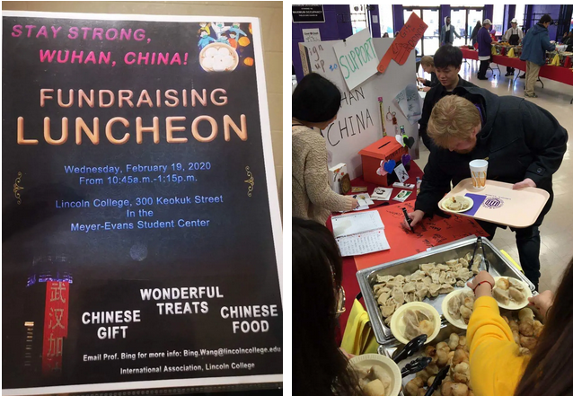 2月19日,我校赴美国伊利诺伊州林肯学院交流的13名师生在林肯学院学生餐厅自发组织“Stay Strong, Wuhan, China” (武汉加油、中国加油)大型募捐午餐活动,远隔万水千山为祖国送爱心、递真情。
