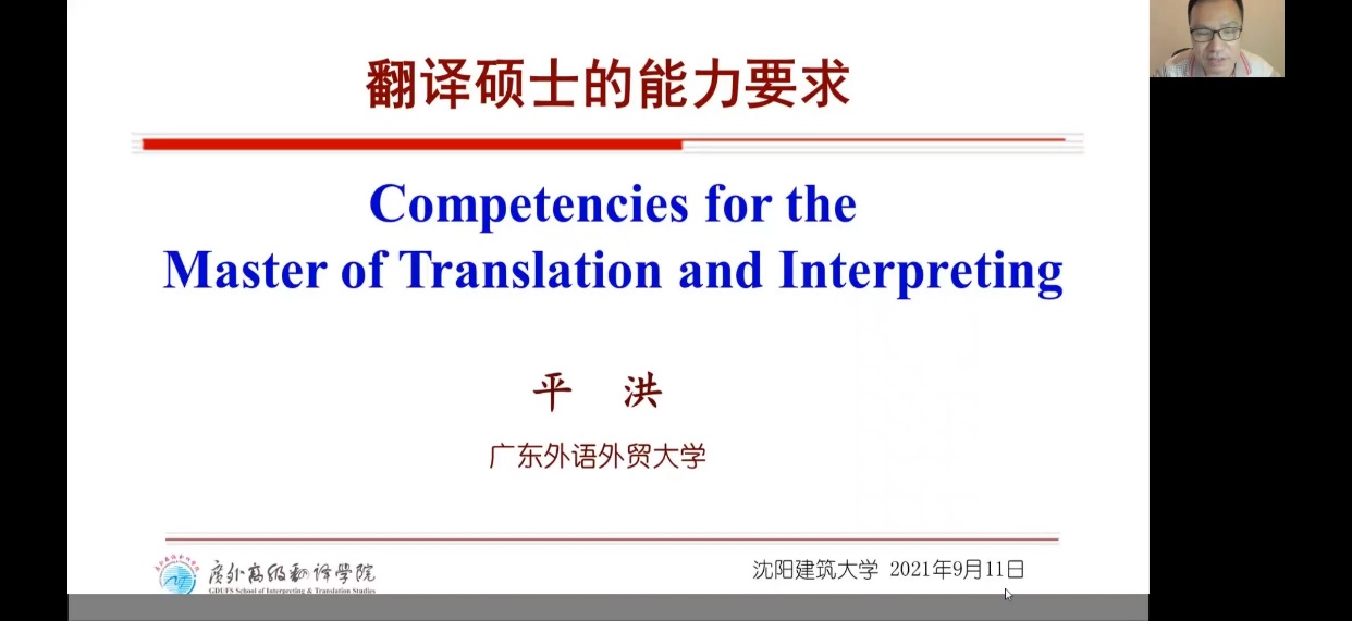 9月11日,广东外语外贸大学高级翻译学院平洪教授应邀为我校竞猜网APP官方下载作了题为“翻译硕士的能力要求”的线上学术讲座,学院教师、翻译硕士及英语专业学生参加了本次讲座。