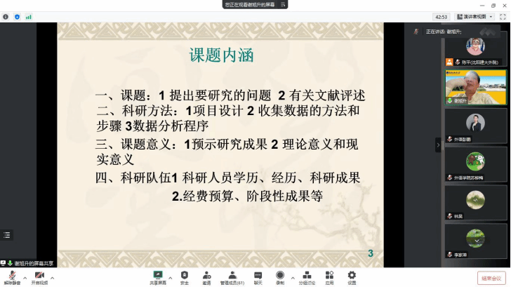 为提高学院老师科研项目申报能力,进一步做好2023年国家社科基金申报工作,3月9日晚,竞猜网APP官方下载邀请原新疆大学二级教授、全国翻译专业教指委学术委员会委员,现吉林外国语大学翻译学科带头人、我校校聘教授谢旭升为学院全体教师作线上专题讲座。 谢旭升教授以“国家社科基金申报书撰写培训”为主题,从申报课题的意义、动机、课题选题的细节、申报课题的注意事项以及不成功课题存在的问题等方面进行详细分析阐释,深入浅出的讲解让老师们明确了国家社科基金课题的地域性、实效性和重要性。讲座后,谢旭升教授与老师们进行了气氛热烈的互动交流。 此次专题讲座加深了学院老师对国家社科基金的了解,开拓了老师们的科研视野,增强了老师们申报高级别科研项目的信心,积极推动了学院的国社科基金项目申报工作。 |