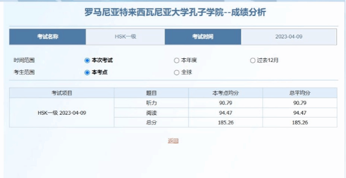 4月9日我校特来西瓦尼亚大学孔子学院组织了2019年5月以来第一次线下考试,孔院19位在读学生参加了HSK一级考试,其中有9名大一学生,4名高中生,5名小学生和1名社会成人学生。5月13日成绩公布,所有考生全部顺利通过,200分满分,我院考生平均分达到185分,其中2名大一学生,1名高中生获得了满分,5名大一学生,3名高中生和1名小学生获得190分以上好成绩。本次考试充分体现了我校孔院较高的教学质量和任课教师较高的教学水平,对于更多中文学习者也起到了一个极大的鼓舞作用。
