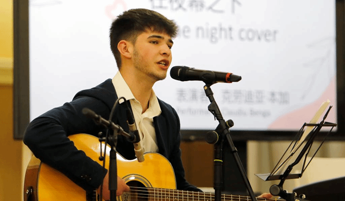 孔院优秀学员代表索菲娅的中文歌曲《好像掉进爱情里》演唱,与克劳迪亚·本加带来的罗马尼亚流行歌曲的中文版《在夜幕之下》吉他弹唱,展示出了优秀的中文学习成果,表达出罗马尼亚人民对中国文化的热爱和欣赏,促进中罗两国人民之间的文化交流与融合。